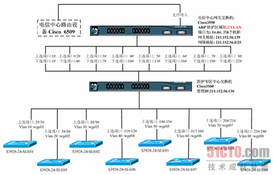 基于以上两种ARP欺骗de方式,我公司在上海电信外高桥数据中心采用独立网段加上双向绑定de方法设立了防ARP欺骗攻击专区,拓朴结构示意图如下: