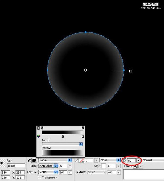 2、用中间黑色,四周白色进行渐变填充,白色设置透明度为55%。