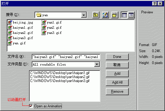 合并已有图片形成动画,顾名思义就是将一系列图片按顺序排列在不同的帧中从而生成动画,当然,首先我们必须有一串连续的图片,然后,在 Fireworks中,选择菜单指令“File/Open Multiple”,这时将弹出“打开”对话框(如图1), 进入所需图片所在的目录,然后按照动画中图片显示的顺序依次选取图片,并单击“Add”按钮将这三张图片加入到对话框下面的窗口;注意:我们还必须勾选对话框最下面的“Open as Animation”(以动画打开)选项,不然的话,我们打开的将是三张分开的静态图片;最后,单击“Done”(完成)按钮。